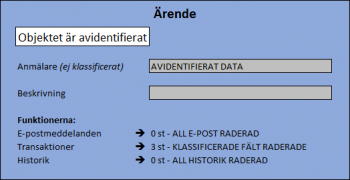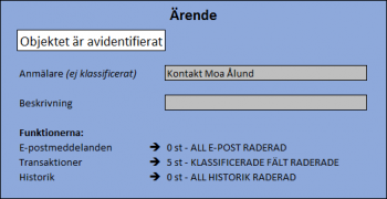 Kopplingen i objektsökfältet Anmälare har kopplingen kvar till objektet, men där står (AVIDENTIFIERAT DATA).