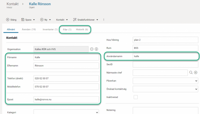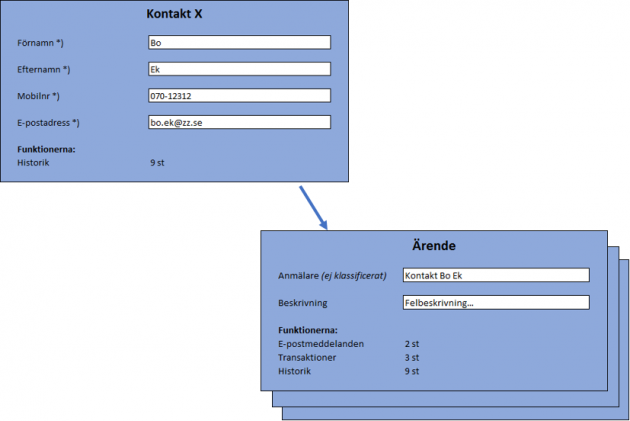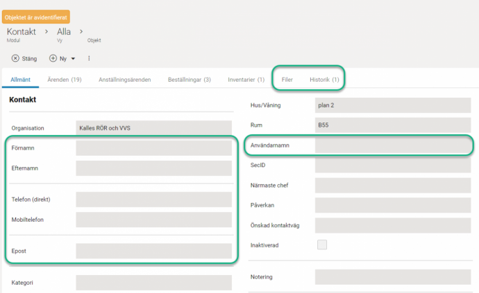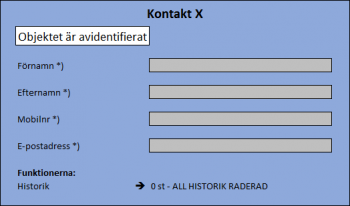 I vårt exempel finns kontakter lagrade med personuppgifter i fyra fält. Eftersom historiken visar vad som lagrats i fälten varje gång kontakten sparats, så finns ju personuppgifter även i funktionen Historik. Kontakten kan också finnas kopplad på ärenden då den är vald som anmälare (i objektsöksfältet).