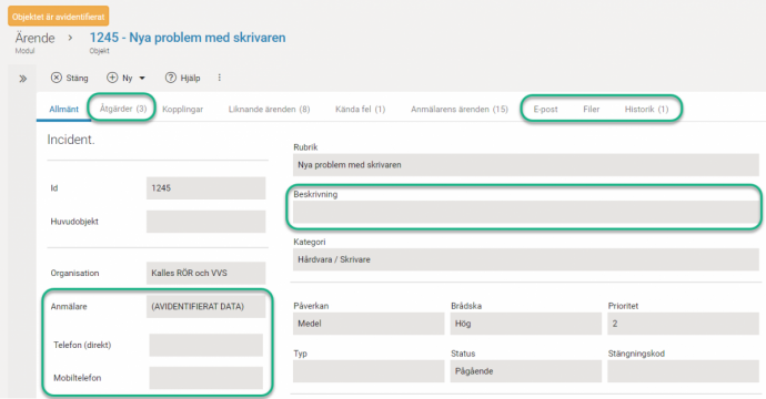 Efter avidentifieringen ser ärendet ut så här: