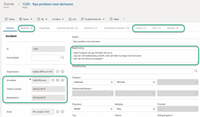 I ärendemodulen har vi valt att klassificera följande fält: